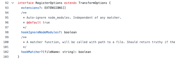 });这并非是 esbuild 内部的配置而是描述 esbuild-register 行为的配置。目前还没有任何文档有详细的说明,从 源码 的注释解释是自动忽略对 node_modules 下文件的翻译
