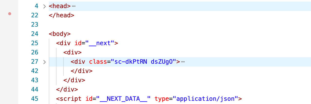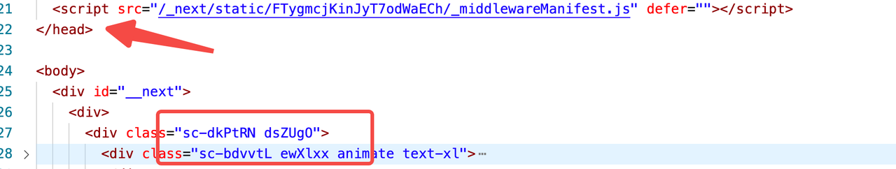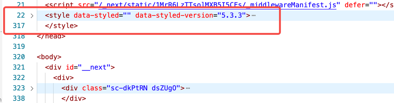 发现经过哈希运算的 className 已经被生成并插入到对应的元素上,但在 <head> 上并没有对应的样式表,这就是首屏出现样式缺失导致排版错乱的最终原因。