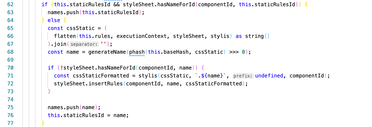 抛开复杂的动态样式不谈,我们可以从 styled-components 的核心源码 ComponentStyle.ts 发现对样式的处理最终落到 styleSheet.insertRules 的插入。