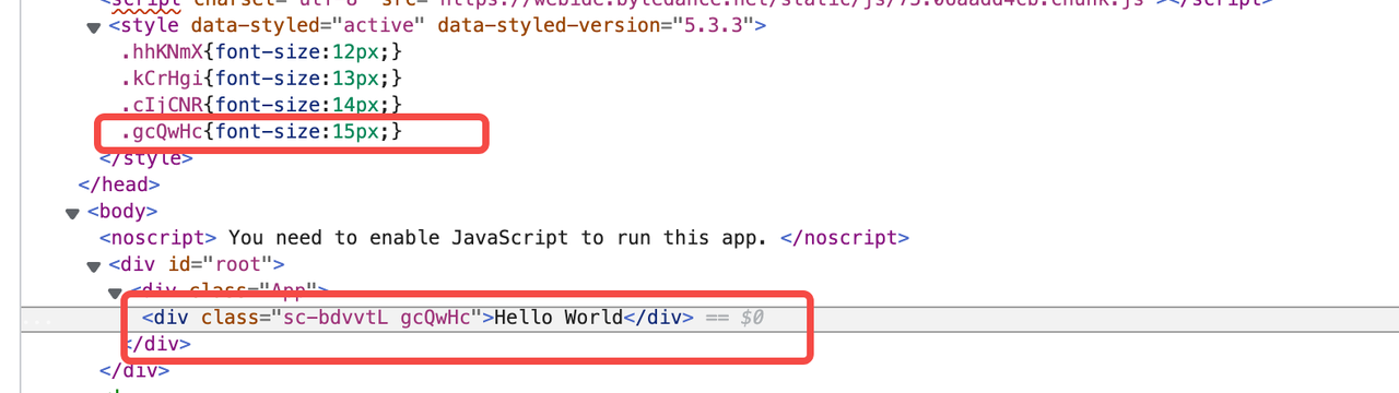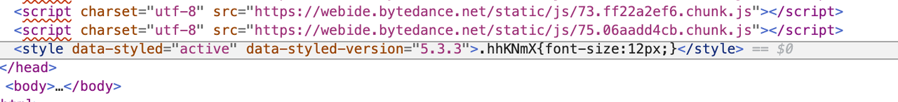那么样式缺失的问题来自于哪里呢?其实不难发现上面 demo 的样式是依靠 attribute 插入的,而真实的 styled 则是为元素增加了哈希 className,那么这个 className 对应的样式表去了哪里就不言而喻了。