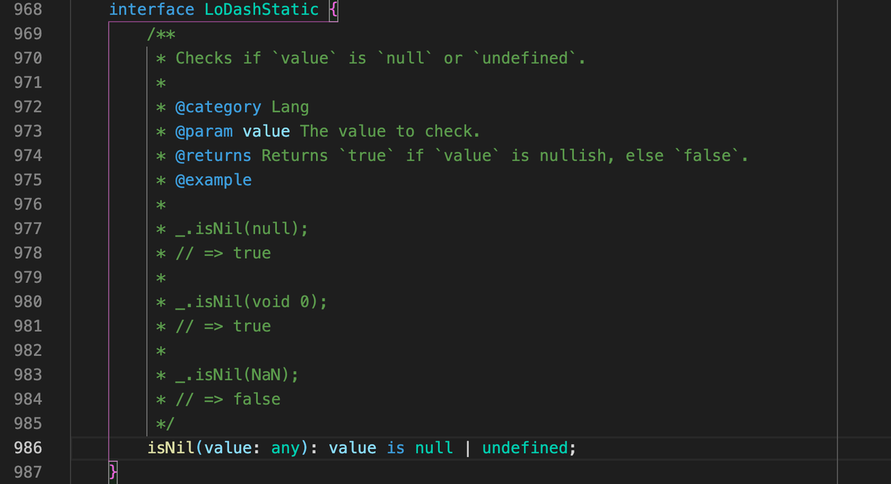 看完说明和用例我就恍然大悟了,其实如果经常写库,is 是一个非常常见的关键词,我们可以看一下 lodash 的声明文件,比如比较常用的 isNil,我们可以认为这是一种断言函数