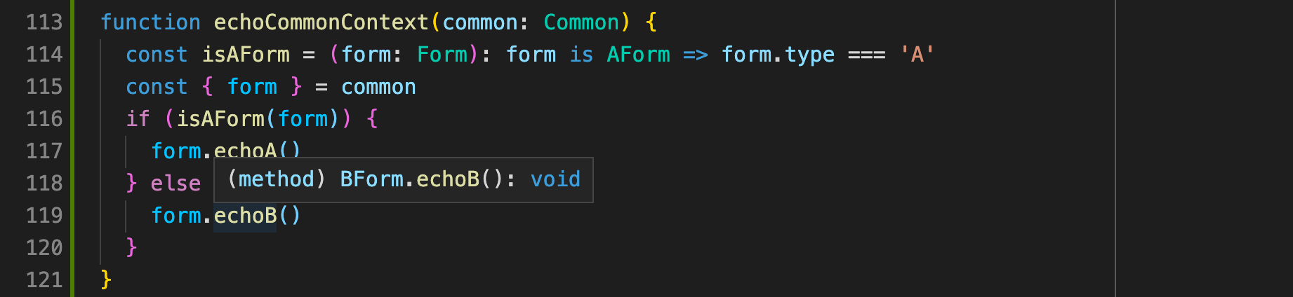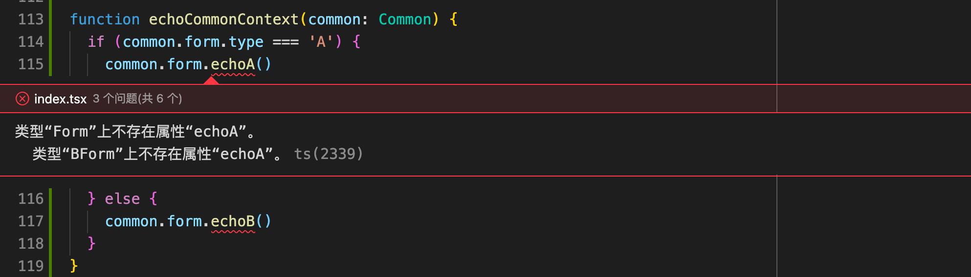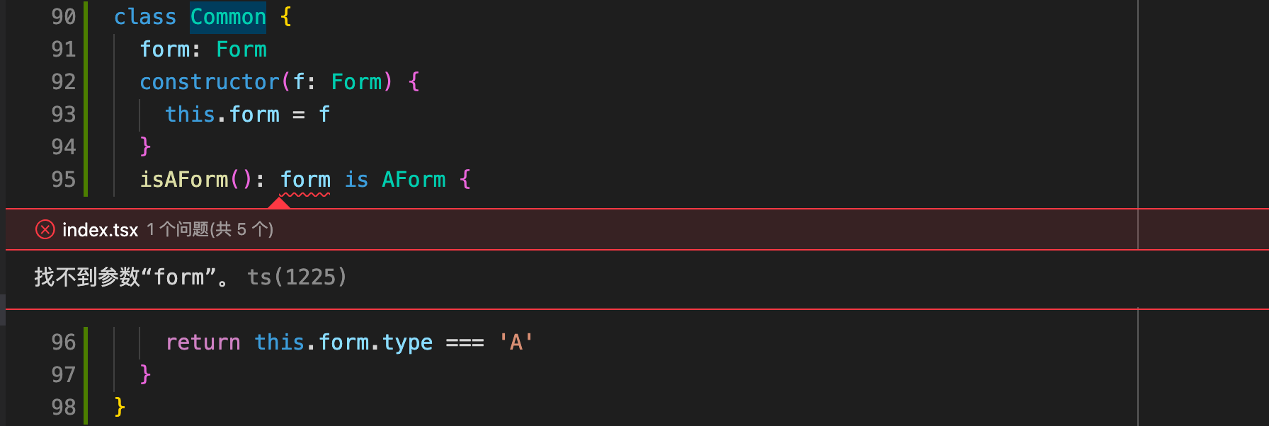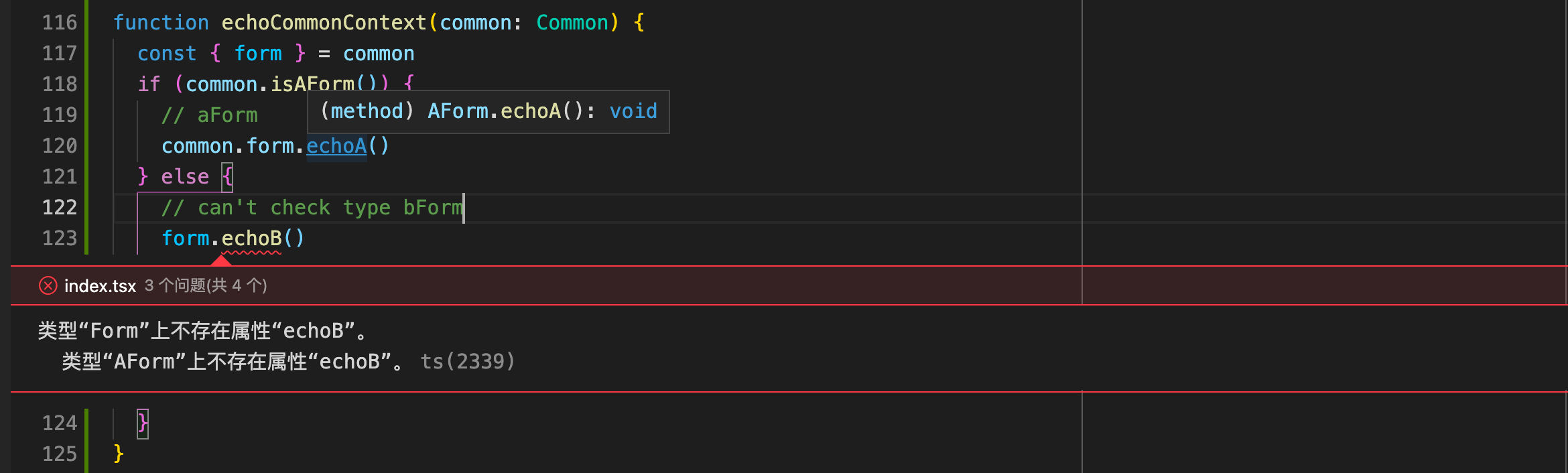 可以看到在 common.isAForm() 之前,我们如果已经赋值 const { form } = common,那么这个 form 仍然无法被 TypeScript 确定类型。