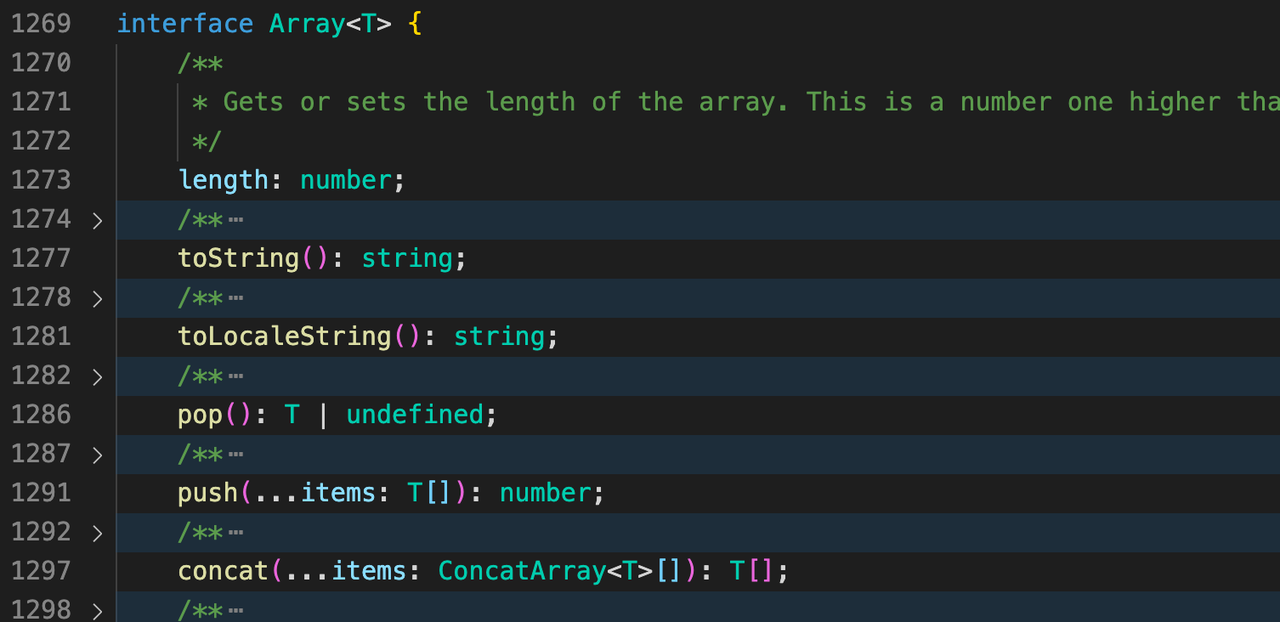 可以看到接口 Array 存在范型 T,也就是说我们在 new Array 时就会确定 T 的类型,我们上述代码中的 […] 其实也是 new Array 的一种语法糖