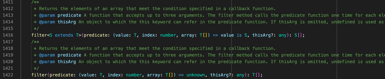 filter 是 Array 原型上的函数,所以我们可以研究一下对应的类型文件: